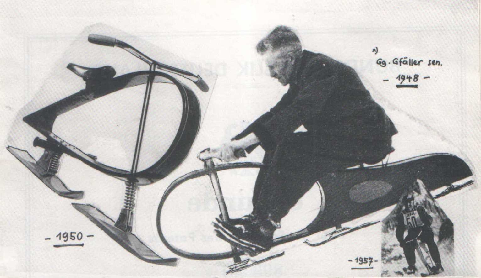 a podstawowym surowcem był odpowiedni gatunek drewna. Ze względu na kształt ramy nośnej pojazd ten nazwano „ jajo Gfällera”. Konstrukcja ta daje użytkownikom komfort jazdy na nierównościach nartostrad. Konstruktor będąc użytkownikiem pojazdu bardzo często wnosi pewne udogodnienia. Przełom lat 40-tych i 50-tych. Konstruktor przy montażu płóz stosuje następne tłumienie sprężynowe – tył 2 sprężyny, przód jedna, co polepsza komfort i bezpieczeństwo dla użytkownika. Montuje też oparcie stóp.
