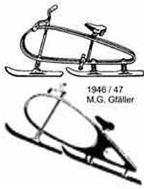a podstawowym surowcem był odpowiedni gatunek drewna. Ze względu na kształt ramy nośnej pojazd ten nazwano „ jajo Gfällera”. Konstrukcja ta daje użytkownikom komfort jazdy na nierównościach nartostrad. Konstruktor będąc użytkownikiem pojazdu bardzo często wnosi pewne udogodnienia. Przełom lat 40-tych i 50-tych. Konstruktor przy montażu płóz stosuje następne tłumienie sprężynowe – tył 2 sprężyny, przód jedna, co polepsza komfort i bezpieczeństwo dla użytkownika. Montuje też oparcie stóp.